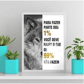 Quadro motivacional lobo 33x24cm Moldura: madeira preta Informações do produto tire todas as suas dúvidas no descritivo abaixo: decoração para quarto, sala, cozinha, escritório, área gourmet e muito mais. Chega de paredes vazias medidas - cada peça tem 33x24cm a4 . Material do papel - papel fotográfico brilhante de altíssima resolução acabamento - todos os quadros são acompanhados de uma película de acetato para proteção da imagem. - os quadros são embalados de forma segura com plástico bolha com camada dupla de acordo com o tamanho dos quadros. - de 3 meses. Meu quadro chegou. Como posso fixá-lo Você precisa apenas de um martelo e um prego, pois os quadros já vão acompanhados de penduradores. Esta é a forma mais indicada. Caso prefira, você pode utilizar uma fita dupla face neste caso, sugerimos de alta qualidade para evitar que descole e seu quadro caia . Como posso limpar meu quadro A limpeza é feita como um móvel comum da sua casa. Apenas um pano seco ou espanador são suficientes para tal