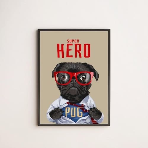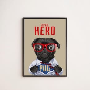 Quadro my super hero pug 45x34cm - com vidro Moldura: madeira preta Informações do produto tire todas as suas dúvidas no descritivo abaixo: decoração para quarto, sala, cozinha, escritório, área gourmet e muito mais. Chega de paredes vazias medidas - cada peça tem 45x34cm a3 . Material do papel - papel fotográfico brilhante de altíssima resolução acabamento - todos os quadros são acompanhados de vidro para proteção da imagem. - moldura em madeira maciça na cor preta e pendurador . - os quadros são embalados de forma segura com plástico bolha com camada dupla de acordo com o tamanho dos quadros. - de 3 meses. Meu quadro chegou. Como posso fixá-lo Você precisa apenas de um martelo e um prego, pois os quadros já vão acompanhados de penduradores. Esta é a forma mais indicada. Como posso limpar meu quadro A limpeza é feita como um móvel comum da sua casa. Apenas um pano seco ou espanador são suficientes para tal