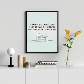 Quadro nada acontece na zona de conforto 24x18cm Moldura: madeira preta Informações do produto tire todas as suas dúvidas no descritivo abaixo: decoração para quarto, sala, cozinha, escritório, área gourmet e muito mais. Chega de paredes vazias medidas - cada peça tem 24x18cm a5 . Material do papel - papel fotográfico brilhante de altíssima resolução acabamento - todos os quadros são acompanhados de uma película de acetato para proteção da imagem. - os quadros são embalados de forma segura com plástico bolha com camada dupla de acordo com o tamanho dos quadros. Garantia - garantia de 3 meses. Meu quadro chegou. Como posso fixá-lo Você precisa apenas de um martelo e um prego, pois os quadros já vão acompanhados de penduradores. Esta é a forma mais indicada. Caso prefira, você pode utilizar uma fita dupla face neste caso, sugerimos de alta qualidade para evitar que descole e seu quadro caia . Como posso limpar meu quadro A limpeza é feita como um móvel comum da sua casa. Apenas um pano seco ou espanador são suficientes para tal