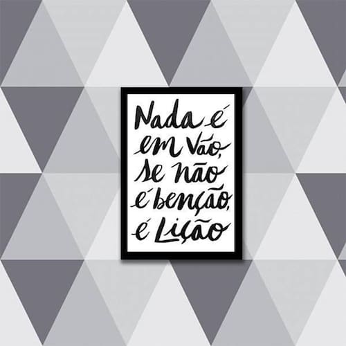 Quadro Nada É Em Vão, Se Não É Benção, É Lição 24X18Cm Moldura: madeira branca Informações do produto Decoração para quarto, sala, cozinha, escritório, área gourmet e muito mais. Chega de paredes vazias. Medidas - cada peça tem 24x18cm a5 . Material do papel - papel fotográfico brilhante de altíssima resolução Acabamento - todos os quadros são acompanhados de uma película de acetato para proteção da imagem. - moldura em madeira maciça na cor branca e pendurador móvel que pode ser retirado facilmente caso deseje fixar com fita dupla face. - os quadros são embalados de forma segura com plástico bolha com camada dupla de acordo com o tamanho dos quadros. - de 3 meses Meu quadro chegou. Como posso fixá-lo: Você precisa apenas de um martelo e um prego, pois os quadros já vão acompanhados de penduradores. Esta é a forma mais indicada. Caso prefira, você pode utilizar uma fita dupla face neste caso, sugerimos de alta qualidade para evitar que descole e seu quadro caia . Como posso limpar meu quadro: A limpeza é feita como um móvel comum da sua casa. Apenas um pano seco ou espanador são suficientes para tal