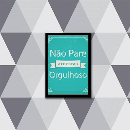 Quadro Não Pare Até Estar Orgulhoso 24X18Cm Moldura: madeira branca Informações do produto Decoração para quarto, sala, cozinha, escritório, área gourmet e muito mais. Chega de paredes vazias. Medidas - cada peça tem 24x18cm a5 . Material do papel - papel fotográfico brilhante de altíssima resolução Acabamento - todos os quadros são acompanhados de uma película de acetato para proteção da imagem. - moldura em madeira maciça na cor branca e pendurador móvel que pode ser retirado facilmente caso deseje fixar com fita dupla face. - os quadros são embalados de forma segura com plástico bolha com camada dupla de acordo com o tamanho dos quadros. - de 3 meses Meu quadro chegou. Como posso fixá-lo: Você precisa apenas de um martelo e um prego, pois os quadros já vão acompanhados de penduradores. Esta é a forma mais indicada. Caso prefira, você pode utilizar uma fita dupla face neste caso, sugerimos de alta qualidade para evitar que descole e seu quadro caia . Como posso limpar meu quadro: A limpeza é feita como um móvel comum da sua casa. Apenas um pano seco ou espanador são suficientes para tal