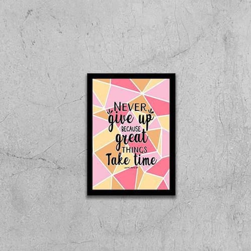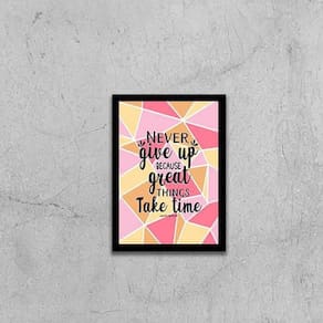 Quadro Never Give Up Because Great Things Take Time 24X18Cm Moldura: madeira branca Informações do produto Decoração para quarto, sala, cozinha, escritório, área gourmet e muito mais. Chega de paredes vazias. Medidas - cada peça tem 24x18cm a5 . Material do papel - papel fotográfico brilhante de altíssima resolução Acabamento - todos os quadros são acompanhados de uma película de acetato para proteção da imagem. - moldura em madeira maciça na cor branca e pendurador móvel que pode ser retirado facilmente caso deseje fixar com fita dupla face. - os quadros são embalados de forma segura com plástico bolha com camada dupla de acordo com o tamanho dos quadros. - de 3 meses Meu quadro chegou. Como posso fixá-lo: Você precisa apenas de um martelo e um prego, pois os quadros já vão acompanhados de penduradores. Esta é a forma mais indicada. Caso prefira, você pode utilizar uma fita dupla face neste caso, sugerimos de alta qualidade para evitar que descole e seu quadro caia . Como posso limpar meu quadro: A limpeza é feita como um móvel comum da sua casa. Apenas um pano seco ou espanador são suficientes para tal Marca: Não Informado Ean: 7892091052739