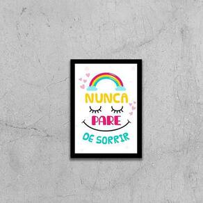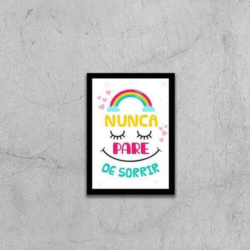 Quadro Nunca Pare De Sorrir 24X18Cm Moldura: madeira branca Informações do produto Decoração para quarto, sala, cozinha, escritório, área gourmet e muito mais. Chega de paredes vazias. Medidas - cada peça tem 24x18cm a5 . Material do papel - papel fotográfico brilhante de altíssima resolução Acabamento - todos os quadros são acompanhados de uma película de acetato para proteção da imagem. - moldura em madeira maciça na cor branca e pendurador móvel que pode ser retirado facilmente caso deseje fixar com fita dupla face. - os quadros são embalados de forma segura com plástico bolha com camada dupla de acordo com o tamanho dos quadros. - de 3 meses Meu quadro chegou. Como posso fixá-lo: Você precisa apenas de um martelo e um prego, pois os quadros já vão acompanhados de penduradores. Esta é a forma mais indicada. Caso prefira, você pode utilizar uma fita dupla face neste caso, sugerimos de alta qualidade para evitar que descole e seu quadro caia . Como posso limpar meu quadro: A limpeza é feita como um móvel comum da sua casa. Apenas um pano seco ou espanador são suficientes para tal Marca: Não Informado