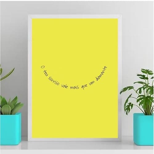 Quadro o teu sorriso vale mais que diamante 33x24cm Moldura: madeira branca Informações do produto Decoração para quarto, sala, cozinha, escritório, área gourmet e muito mais. Chega de paredes vazias Medidas - cada peça tem 33x24cm a4 . Material do papel - papel fotográfico brilhante de altíssima resolução Acabamento - todos os quadros são acompanhados de uma película de acetato para proteção da imagem. - os quadros são embalados de forma segura com plástico bolha com camada dupla de acordo com o tamanho dos quadros. - de 3 meses. Meu quadro chegou. Como posso fixá-lo Você precisa apenas de um martelo e um prego, pois os quadros já vão acompanhados de penduradores. Esta é a forma mais indicada. Caso prefira, você pode utilizar uma fita dupla face neste caso, sugerimos de alta qualidade para evitar que descole e seu quadro caia . Como posso limpar meu quadro A limpeza é feita como um móvel comum da sua casa. Apenas um pano seco ou espanador são suficientes para tal