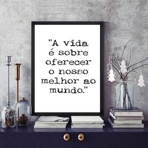 Quadro oferecer o melhor ao mundo 24x18cm - com vidro Cor: moldura preta Informações do produto tire todas as suas dúvidas no descritivo abaixo: decoração para quarto, sala, cozinha, escritório, área gourmet e muito mais. Chega de paredes vazias medidas - cada peça tem 24x18cm a5 . Material do papel - papel fotográfico brilhante de altíssima resolução acabamento - todos os quadros são acompanhados de vidro para proteção da imagem. - moldura em madeira maciça na cor preta ou branca conforme produto escolhido e pendurador . - os quadros são embalados de forma segura com plástico bolha com camada dupla de acordo com o tamanho dos quadros. Garantia - garantia de 3 meses. Meu quadro chegou. Como posso fixá-lo Você precisa apenas de um martelo e um prego, pois os quadros já vão acompanhados de penduradores. Esta é a forma mais indicada. Como posso limpar meu quadro A limpeza é feita como um móvel comum da sua casa. Apenas um pano seco ou espanador são suficientes para tal