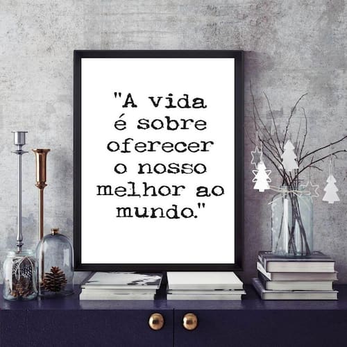 Quadro oferecer o melhor ao mundo 45x34cm - com vidro Cor: moldura branca Informações do produto tire todas as suas dúvidas no descritivo abaixo: decoração para quarto, sala, cozinha, escritório, área gourmet e muito mais. Chega de paredes vazias medidas - cada peça tem 45x34cm a3 . Material do papel - papel fotográfico brilhante de altíssima resolução acabamento - todos os quadros são acompanhados de vidro para proteção da imagem. - moldura em madeira maciça na cor preta ou branca conforme produto escolhido e pendurador . - os quadros são embalados de forma segura com plástico bolha com camada dupla de acordo com o tamanho dos quadros. Garantia - garantia de 3 meses. Meu quadro chegou. Como posso fixá-lo Você precisa apenas de um martelo e um prego, pois os quadros já vão acompanhados de penduradores. Esta é a forma mais indicada. Como posso limpar meu quadro A limpeza é feita como um móvel comum da sua casa. Apenas um pano seco ou espanador são suficientes para tal