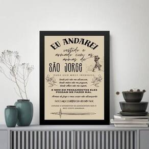 Quadro oração de são jorge - bege 45x34cm Cor: moldura branca Informações do produto tire todas as suas dúvidas no descritivo abaixo: decoração para quarto, sala, cozinha, escritório, área gourmet e muito mais. Chega de paredes vazias. Medidas - cada peça tem 45x34cm a3 . Material do papel - papel fotográfico brilhante de altíssima resolução acabamento - todos os quadros são acompanhados de uma película de acetato para proteção da imagem. - os quadros são embalados de forma segura com plástico bolha com camada dupla de acordo com o tamanho dos quadros. Garantia - garantia de 3 meses. Meu quadro chegou. Como posso fixá-lo Você precisa apenas de um martelo e um prego, pois os quadros já vão acompanhados de penduradores. Esta é a forma mais indicada. Caso prefira, você pode utilizar uma fita dupla face neste caso, sugerimos de alta qualidade para evitar que descole e seu quadro caia . Como posso limpar meu quadro A limpeza é feita como um móvel comum da sua casa. Apenas um pano seco ou espanador são suficientes para tal