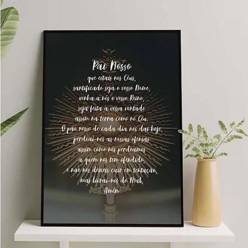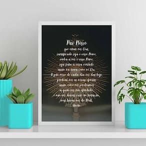 Quadro oração pai nosso - santíssimo 45x34cm - com vidro Moldura: madeira branca Informações do produto tire todas as suas dúvidas no descritivo abaixo: decoração para quarto, sala, cozinha, escritório, área gourmet e muito mais. Chega de paredes vazias medidas - cada peça tem 45x34cm a3 . Material do papel - papel fotográfico brilhante de altíssima resolução acabamento - todos os quadros são acompanhados de vidro para proteção da imagem. - moldura em madeira maciça na cor preta ou branca conforme produto escolhido e pendurador . - os quadros são embalados de forma segura com plástico bolha com camada dupla de acordo com o tamanho dos quadros. Garantia - garantia de 3 meses. Meu quadro chegou. Como posso fixá-lo Você precisa apenas de um martelo e um prego, pois os quadros já vão acompanhados de penduradores. Esta é a forma mais indicada. Como posso limpar meu quadro A limpeza é feita como um móvel comum da sua casa. Apenas um pano seco ou espanador são suficientes para tal Ean: 7894507224457