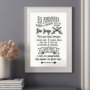 Quadro oração para são jorge - 60x48cm Cor: moldura branca Informações do produto tire todas as suas dúvidas no descritivo abaixo: decoração para quarto, sala, cozinha, escritório, área gourmet e muito mais. Chega de paredes vazias medidas - cada peça tem 60x48cm . Material do papel - papel fotográfico brilhante de altíssima resolução acabamento - todos os quadros são acompanhados de vidro para proteção da imagem. - moldura em madeira maciça na cor preta ou branca conforme produto escolhido e pendurador. - paspatur branco com 7cm de largura - os quadros são embalados de forma segura com plástico bolha com camada dupla de acordo com o tamanho dos quadros. Garantia - garantia de 3 meses. Meu quadro chegou. Como posso fixá-lo Você precisa apenas de um martelo e um prego, pois os quadros já vão acompanhados de penduradores. Esta é a forma mais indicada. Como posso limpar meu quadro A limpeza é feita como um móvel comum da sua casa. Apenas um pano seco ou espanador são suficientes para tal Ean: 7891234528940