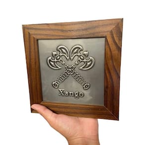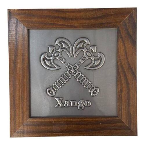 Quadro Orixá Xangô 2M Em Aço e Madeira Imbuia 18 x18 cm Adicione uma aura de poder e justiça ao seu espaço com este magnífico quadro artesanal representando Xangô com seus machados cruzados.