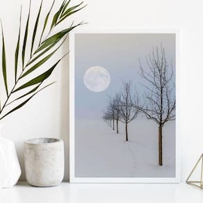 O Quadro Paisagem Neve Árvores Lua é perfeito para decorar seu quarto, sala, cozinha, escritório, área gourmet e muito mais. Chega de paredes vazias! Com medidas de 45x34cm A3 , este quadro possui um lindo design de paisagem de neve com árvores e lua, trazendo uma atmosfera tranquila e aconchegante para o ambiente.