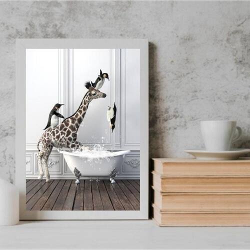 Quadro para banheiro - girafa e pinguins 45x34cm Moldura: madeira preta Informações do produto tire todas as suas dúvidas no descritivo abaixo: decoração para quarto, sala, cozinha, escritório, área gourmet e muito mais. Chega de paredes vazias. Medidas - cada peça tem 45x34cm a3 . Material do papel - papel fotográfico brilhante de altíssima resolução acabamento - todos os quadros são acompanhados de uma película de acetato para proteção da imagem. - os quadros são embalados de forma segura com plástico bolha com camada dupla de acordo com o tamanho dos quadros. Garantia - garantia de 3 meses. Meu quadro chegou. Como posso fixá-lo Você precisa apenas de um martelo e um prego, pois os quadros já vão acompanhados de penduradores. Esta é a forma mais indicada. Caso prefira, você pode utilizar uma fita dupla face neste caso, sugerimos de alta qualidade para evitar que descole e seu quadro caia . Como posso limpar meu quadro A limpeza é feita como um móvel comum da sua casa. Apenas um pano seco ou espanador são suficientes para tal