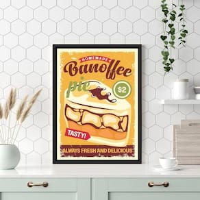 Quadro para cozinha bolo banoffee 33x24cm Cor: moldura preta Informações do produto tire todas as suas dúvidas no descritivo abaixo: decoração para quarto, sala, cozinha, escritório, área gourmet e muito mais. Chega de paredes vazias medidas - cada peça tem 33x24cm a4 . Material do papel - papel fotográfico brilhante de altíssima resolução acabamento - todos os quadros são acompanhados de uma película de acetato para proteção da imagem. - os quadros são embalados de forma segura com plástico bolha com camada dupla de acordo com o tamanho dos quadros. Garantia - garantia de 3 meses. Meu quadro chegou. Como posso fixá-lo Você precisa apenas de um martelo e um prego, pois os quadros já vão acompanhados de penduradores. Esta é a forma mais indicada. Caso prefira, você pode utilizar uma fita dupla face neste caso, sugerimos de alta qualidade para evitar que descole e seu quadro caia . Como posso limpar meu quadro A limpeza é feita como um móvel comum da sua casa. Apenas um pano seco ou espanador são suficientes para tal