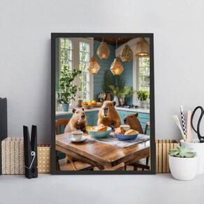 Quadro para cozinha - família capivaras 33x24cm - com vidro Moldura: madeira branca Informações do produto tire todas as suas dúvidas no descritivo abaixo: decoração para quarto, sala, cozinha, escritório, área gourmet e muito mais. Chega de paredes vazias medidas - cada peça tem 33x24cm a4 . Material do papel - papel fotográfico brilhante de altíssima resolução acabamento - todos os quadros são acompanhados de vidro para proteção da imagem. - moldura em madeira maciça na cor preta ou branca conforme produto escolhido e pendurador . - os quadros são embalados de forma segura com plástico bolha com camada dupla de acordo com o tamanho dos quadros. Garantia - garantia de 3 meses. Meu quadro chegou. Como posso fixá-lo Você precisa apenas de um martelo e um prego, pois os quadros já vão acompanhados de penduradores. Esta é a forma mais indicada. Como posso limpar meu quadro A limpeza é feita como um móvel comum da sua casa. Apenas um pano seco ou espanador são suficientes para tal