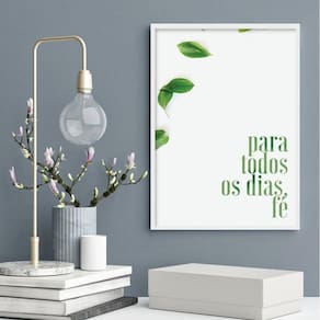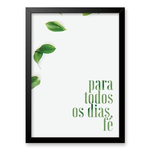 Quadro para todos os dias fé 33x24cm Cor: moldura preta Informações do produto tire todas as suas dúvidas no descritivo abaixo: decoração para quarto, sala, cozinha, escritório, área gourmet e muito mais. Chega de paredes vazias medidas - cada peça tem 33x24cm a4 . Material do papel - papel fotográfico brilhante de altíssima resolução acabamento - todos os quadros são acompanhados de uma película de acetato para proteção da imagem. - os quadros são embalados de forma segura com plástico bolha com camada dupla de acordo com o tamanho dos quadros. Garantia - garantia de 3 meses. Meu quadro chegou. Como posso fixá-lo Você precisa apenas de um martelo e um prego, pois os quadros já vão acompanhados de penduradores. Esta é a forma mais indicada. Caso prefira, você pode utilizar uma fita dupla face neste caso, sugerimos de alta qualidade para evitar que descole e seu quadro caia . Como posso limpar meu quadro A limpeza é feita como um móvel comum da sua casa. Apenas um pano seco ou espanador são suficientes para tal