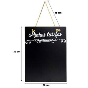 Quadro organizador de tarefas diversas. Anotações em giz ou caneta giz de fácil remoção. De fácil colocação apenas apoio na parede com auxílio de um prego. OBS: Não acompanha giz ou caneta giz.