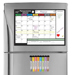 - 1 Quadro magnético de planejamento mensal - 8 Canetas coloridas premium com ponta fina, apagador e imã (fixam diretamente na geladeira)