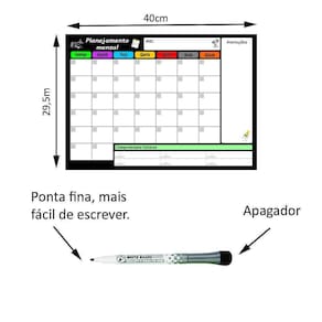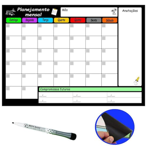 Quadro Planejamento Tarefas Mensal Magnético Imã Geladeira Este quadro magnético para o planejamento de compromissos mensais é uma ferramenta prática e eficaz para manter o controle das atividades e compromissos ao longo do mês. Esse quadro é especialmente útil quando colocado na geladeira, um local de fácil acesso e visibilidade na maioria das casas. Ele ajuda a organizar os compromissos, eventos e tarefas importantes de maneira visual e intuitiva. A parte de trás é totalmente coberta por manta de imã super aderente. Juntamente, é enviada uma caneta preta de ponta fina e com borracha tipo espuma na ponta. Ela também possui um imã em seu corpo, o que permite sua fixação na geladeira. Caso a tinta acabe, esta caneta pode ser facilmente encontrada em qualquer papelaria.