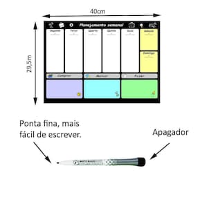 Quadro Planejamento Tarefas Semanal Magnético Imã Geladeira Este quadro magnético para o planejamento de compromissos semanais é uma ferramenta prática e eficaz para manter o controle das atividades e compromissos ao longo da semana. Esse quadro é especialmente útil quando colocado na geladeira, um local de fácil acesso e visibilidade na maioria das casas. Ele ajuda a organizar os compromissos, eventos e tarefas importantes de maneira visual e intuitiva. A parte de trás é totalmente coberta por manta de imã super aderente. Juntamente, é enviada uma caneta preta de ponta fina e com borracha tipo espuma na ponta. Ela também possui um imã em seu corpo, o que permite sua fixação na geladeira.Caso a tinta acabe, esta caneta pode ser facilmente encontrada em qualquer papelaria. Tamanho do quadro: 29,5cm x 40cm A3