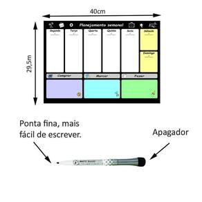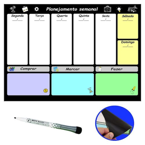 Quadro Planejamento Tarefas Semanal Magnético Imã Geladeira Este quadro magnético para o planejamento de compromissos semanais é uma ferramenta prática e eficaz para manter o controle das atividades e compromissos ao longo da semana. Esse quadro é especialmente útil quando colocado na geladeira, um local de fácil acesso e visibilidade na maioria das casas. Ele ajuda a organizar os compromissos, eventos e tarefas importantes de maneira visual e intuitiva. A parte de trás é totalmente coberta por manta de imã super aderente. Juntamente, é enviada uma caneta preta de ponta fina e com borracha tipo espuma na ponta. Ela também possui um imã em seu corpo, o que permite sua fixação na geladeira. Caso a tinta acabe, esta caneta pode ser facilmente encontrada em qualquer papelaria.