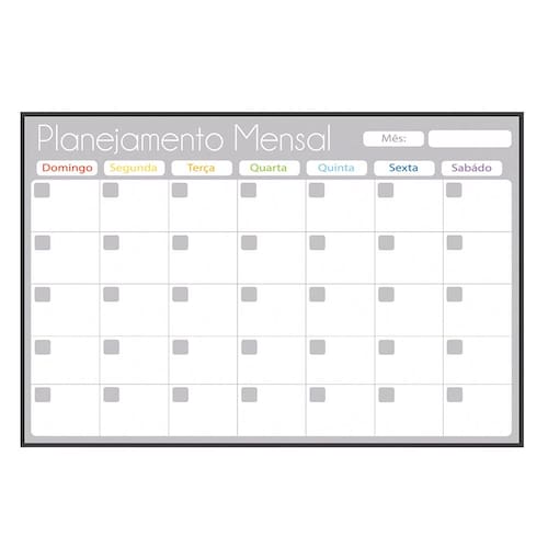 Quadro Planner Mensal Gray MDF Revestido Preto FIT - 60x40 cmPlaneje seu mês com o Quadro Planner Mensal Gray. Este planner possui uma moldura de MDF revestida em preto, combinando durabilidade com um visual contemporâneo. A superfície cinza é perfeita para anotações mensais, ajudando você a manter o controle de compromissos, prazos e eventos importantes. Ideal para ambientes corporativos ou residenciais, ele proporciona uma visão ampla do mês, facilitando o planejamento a longo prazo. Simplifique sua organização mensal com elegância e funcionalidade.