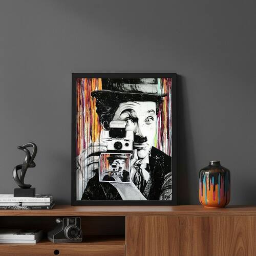 Quadro Pop Art Chaplin Tirando Foto 45x34cm Mold Branca Vidro