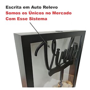 Escrita em auto relevo sob vidro. Pintura automotiva fosca. Acabamento perfeito realizado a laser. Capacidade para aproximadamente 250 rolhas. Abertura superior para inserção das rolhas. Fundo removível para retirada das rolhas. Na embalagem acompanha quadro + vidro frontal 2mm.