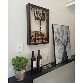 Quadro porta rolhas - poesia engarrafada - 250 rolhas 35 x 52 Você já pensou em eternizar aquele momento incrível que você viveu com seu familiares ou amigos bebendo aquele vinho sensacional É exatamente isso que nosso quadro porta rolhas vai fazer por você. Deposite suas rolhas em nosso quadro e eternize seus momentos e lembranças mais especiais. Nosso quadro porta rolhas combina com vários tipos de decoração e torna qualquer ambiente sofisticado e com muito estilo. Devido a sua cor e acabamento, nosso porta rolhas é extremamente versátil e pode ser para decorar salas de estar, jantar, quartos e até mesmo cozinhas e home-offices. O design moderno e sofisticado do produto vai deixar seu ambiente único, agradável e aconchegante. Os quadros complementam a decoração com beleza e sofisticação trazendo harmonia e alegria ao ambiente. Produzidos com muito carinho, nossos quadros são exclusivos, você só encontra aqui. Tendo como grandes diferenciais o acabamento com pintura preta fosca laqueada, o que torna o produto muito moderno e luxuoso, e principalmente a frente com escrita em auto-relevo. Nosso acabamento em auto-relevo é inovador, não possuindo nada igual no mercado, tornando essa exclusividade outro grande diferencial do nosso produto. Nosso quadro porta rolhas é produzido com madeira de reflorestamento, mdf, vidro 2mm transparência muito superior ao acrílico e finalizado com uma pintura preta super resistente. Não perca tempo, adquira seu quadro porta rolhas agora e comece a colecionar momentos. Tamanho: 52cm altura x 35cm largura x 5,5cm profundidade Capacidade: 250 rolhas aproximadamente Indicações de uso: Pub Homebar Varandas e sacadas gourmet Clubes e grupos de degustação de vinho Cozinhas Salas em geral Home theater Garagens Obs: rolhas não acompanham o produto Marca: Não Informado