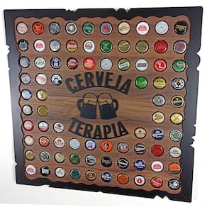 Feito em mdf amadeirado bilaminado de 6mm, tornando a peça bem rústica. Escrita em auto relevo, letras coladas uma a uma. Tampinhas ficam super firmes. Encaixe das tampinhas cortadas á laser, acabamento perfeito. Capacidade para 80 tampinhas Dimensões: 45cm de largura x 45cm de altura x 2cm de profundidade