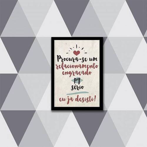 Quadro Procura-Se Relacionamento Engraçado 24X18Cm Moldura: madeira branca Informações do produto Decoração para quarto, sala, cozinha, escritório, área gourmet e muito mais. Chega de paredes vazias. Medidas - cada peça tem 24x18cm a5 . Material do papel - papel fotográfico brilhante de altíssima resolução Acabamento - todos os quadros são acompanhados de uma película de acetato para proteção da imagem. - moldura em madeira maciça na cor branca e pendurador móvel que pode ser retirado facilmente caso deseje fixar com fita dupla face. - os quadros são embalados de forma segura com plástico bolha com camada dupla de acordo com o tamanho dos quadros. - de 3 meses Meu quadro chegou. Como posso fixá-lo: Você precisa apenas de um martelo e um prego, pois os quadros já vão acompanhados de penduradores. Esta é a forma mais indicada. Caso prefira, você pode utilizar uma fita dupla face neste caso, sugerimos de alta qualidade para evitar que descole e seu quadro caia . Como posso limpar meu quadro: A limpeza é feita como um móvel comum da sua casa. Apenas um pano seco ou espanador são suficientes para tal
