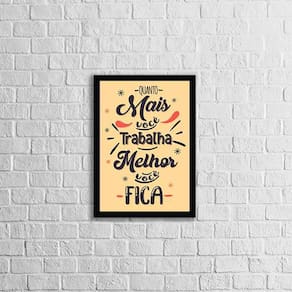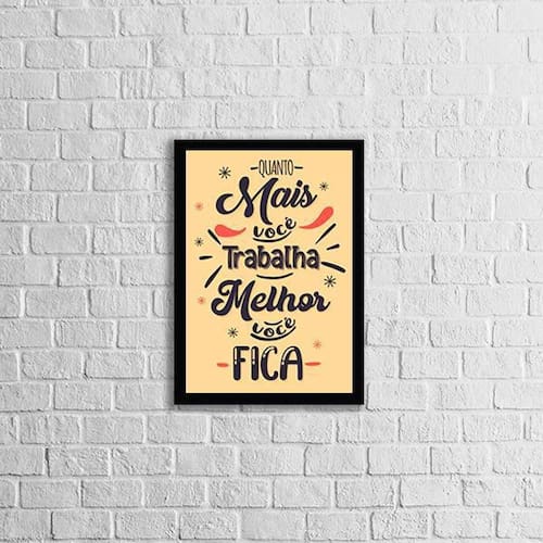 Quadro Quanto Mais Você Trabalha, Melhor Você Fica 24X18Cm Moldura: madeira branca Informações do produto Decoração para quarto, sala, cozinha, escritório, área gourmet e muito mais. Chega de paredes vazias. Medidas - cada peça tem 24x18cm a5 . Material do papel - papel fotográfico brilhante de altíssima resolução Acabamento - todos os quadros são acompanhados de uma película de acetato para proteção da imagem. - moldura em madeira maciça na cor branca e pendurador móvel que pode ser retirado facilmente caso deseje fixar com fita dupla face. - os quadros são embalados de forma segura com plástico bolha com camada dupla de acordo com o tamanho dos quadros. - de 3 meses Meu quadro chegou. Como posso fixá-lo: Você precisa apenas de um martelo e um prego, pois os quadros já vão acompanhados de penduradores. Esta é a forma mais indicada. Caso prefira, você pode utilizar uma fita dupla face neste caso, sugerimos de alta qualidade para evitar que descole e seu quadro caia . Como posso limpar meu quadro: A limpeza é feita como um móvel comum da sua casa. Apenas um pano seco ou espanador são suficientes para tal Marca: Não Informado