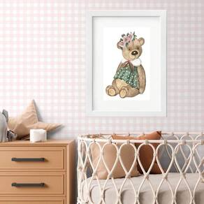 Quadro quarto de bebê ursinha - 60x48cm Moldura: madeira branca Informações do produto tire todas as suas dúvidas no descritivo abaixo: decoração para quarto, sala, cozinha, escritório, área gourmet e muito mais. Chega de paredes vazias medidas - cada peça tem 60x48cm . Material do papel - papel fotográfico brilhante de altíssima resolução acabamento - todos os quadros são acompanhados de vidro para proteção da imagem. - moldura em madeira maciça na cor preta ou branca conforme produto escolhido e pendurador. - paspatur branco com 7cm de largura - os quadros são embalados de forma segura com plástico bolha com camada dupla de acordo com o tamanho dos quadros. Garantia - garantia de 3 meses. Meu quadro chegou. Como posso fixá-lo Você precisa apenas de um martelo e um prego, pois os quadros já vão acompanhados de penduradores. Esta é a forma mais indicada. Como posso limpar meu quadro A limpeza é feita como um móvel comum da sua casa. Apenas um pano seco ou espanador são suficientes para tal
