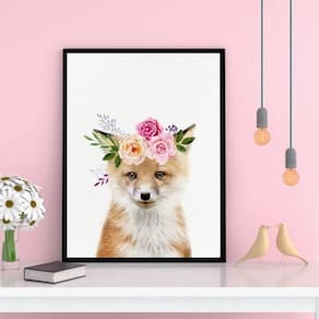Quadro raposinha coroa de flores 33x24cm - com vidro Moldura: madeira preta Informações do produto tire todas as suas dúvidas no descritivo abaixo: decoração para quarto, sala, cozinha, escritório, área gourmet e muito mais. Chega de paredes vazias medidas - cada peça tem 33x24cm a4 . Material do papel - papel fotográfico brilhante de altíssima resolução acabamento - todos os quadros são acompanhados de vidro para proteção da imagem. - moldura em madeira maciça na cor preta e pendurador . - os quadros são embalados de forma segura com plástico bolha com camada dupla de acordo com o tamanho dos quadros. - de 3 meses. Meu quadro chegou. Como posso fixá-lo Você precisa apenas de um martelo e um prego, pois os quadros já vão acompanhados de penduradores. Esta é a forma mais indicada. Como posso limpar meu quadro A limpeza é feita como um móvel comum da sua casa. Apenas um pano seco ou espanador são suficientes para tal Ean: 7895142230780