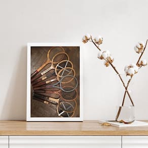 Quadro retrô tênis - fotos raquetes 45x34cm Moldura: madeira branca Informações do produto tire todas as suas dúvidas no descritivo abaixo: decoração para quarto, sala, cozinha, escritório, área gourmet e muito mais. Chega de paredes vazias. Medidas - cada peça tem 45x34cm a3 . Material do papel - papel fotográfico brilhante de altíssima resolução acabamento - todos os quadros são acompanhados de uma película de acetato para proteção da imagem. - os quadros são embalados de forma segura com plástico bolha com camada dupla de acordo com o tamanho dos quadros. Garantia - garantia de 3 meses. Meu quadro chegou. Como posso fixá-lo Você precisa apenas de um martelo e um prego, pois os quadros já vão acompanhados de penduradores. Esta é a forma mais indicada. Caso prefira, você pode utilizar uma fita dupla face neste caso, sugerimos de alta qualidade para evitar que descole e seu quadro caia . Como posso limpar meu quadro A limpeza é feita como um móvel comum da sua casa. Apenas um pano seco ou espanador são suficientes para tal