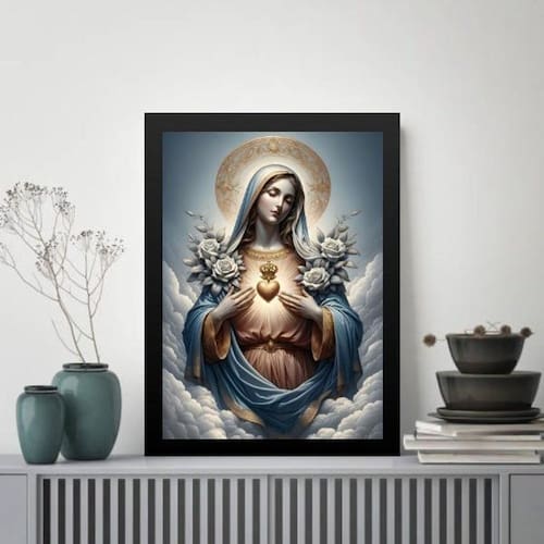 Quadro sacro heart of maria 24x18cm - com vidro Cor: moldura preta Informações do produto tire todas as suas dúvidas no descritivo abaixo: decoração para quarto, sala, cozinha, escritório, área gourmet e muito mais. Chega de paredes vazias medidas - cada peça tem 24x18cm a5 . Material do papel - papel fotográfico brilhante de altíssima resolução acabamento - todos os quadros são acompanhados de vidro para proteção da imagem. - moldura em madeira maciça na cor preta ou branca conforme produto escolhido e pendurador . - os quadros são embalados de forma segura com plástico bolha com camada dupla de acordo com o tamanho dos quadros. - de 3 meses. Meu quadro chegou. Como posso fixá-lo Você precisa apenas de um martelo e um prego, pois os quadros já vão acompanhados de penduradores. Esta é a forma mais indicada. Como posso limpar meu quadro A limpeza é feita como um móvel comum da sua casa. Apenas um pano seco ou espanador são suficientes para tal Ean: 7898916014968