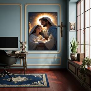 Quadro Sagrada Família - Jesus Maria e José - 70x50cm - Cor: Moldura Branca