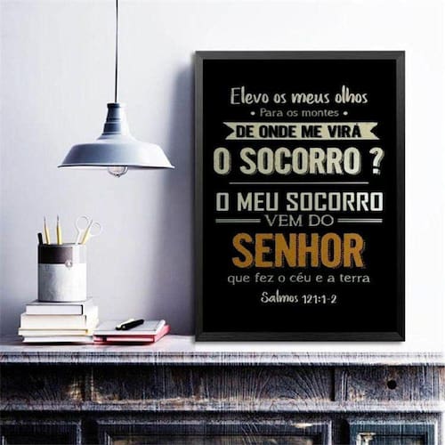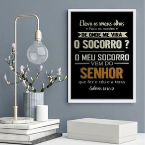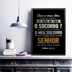 Quadro salmo 121- o socorro vem do senhor 33x24cm Moldura: madeira preta Informações do produto tire todas as suas dúvidas no descritivo abaixo: decoração para quarto, sala, cozinha, escritório, área gourmet e muito mais. Chega de paredes vazias medidas - cada peça tem 33x24cm a4 . Material do papel - papel fotográfico brilhante de altíssima resolução acabamento - todos os quadros são acompanhados de uma película de acetato para proteção da imagem. - os quadros são embalados de forma segura com plástico bolha com camada dupla de acordo com o tamanho dos quadros. Garantia - garantia de 3 meses. Meu quadro chegou. Como posso fixá-lo Você precisa apenas de um martelo e um prego, pois os quadros já vão acompanhados de penduradores. Esta é a forma mais indicada. Caso prefira, você pode utilizar uma fita dupla face neste caso, sugerimos de alta qualidade para evitar que descole e seu quadro caia . Como posso limpar meu quadro A limpeza é feita como um móvel comum da sua casa. Apenas um pano seco ou espanador são suficientes para tal Ean: 7891589092738