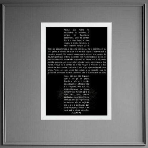 Quadro salmo 91 - cruz 45x34cm Moldura: madeira branca Informações do produto tire todas as suas dúvidas no descritivo abaixo: decoração para quarto, sala, cozinha, escritório, área gourmet e muito mais. Chega de paredes vazias. Medidas - cada peça tem 45x34cm a3 . Material do papel - papel fotográfico brilhante de altíssima resolução acabamento - todos os quadros são acompanhados de uma película de acetato para proteção da imagem. - os quadros são embalados de forma segura com plástico bolha com camada dupla de acordo com o tamanho dos quadros. Garantia - garantia de 3 meses. Meu quadro chegou. Como posso fixá-lo Você precisa apenas de um martelo e um prego, pois os quadros já vão acompanhados de penduradores. Esta é a forma mais indicada. Caso prefira, você pode utilizar uma fita dupla face neste caso, sugerimos de alta qualidade para evitar que descole e seu quadro caia . Como posso limpar meu quadro A limpeza é feita como um móvel comum da sua casa. Apenas um pano seco ou espanador são suficientes para tal