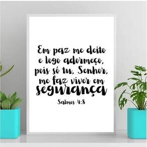 Quadro salmo em paz me deito 33x24cm - com vidro Moldura: madeira branca Informações do produto tire todas as suas dúvidas no descritivo abaixo: decoração para quarto, sala, cozinha, escritório, área gourmet e muito mais. Chega de paredes vazias medidas - cada peça tem 33x24cm a4 . Material do papel - papel fotográfico brilhante de altíssima resolução acabamento - todos os quadros são acompanhados de vidro para proteção da imagem. - moldura em madeira maciça na cor preta e pendurador . - os quadros são embalados de forma segura com plástico bolha com camada dupla de acordo com o tamanho dos quadros. Garantia - garantia de 3 meses. Meu quadro chegou. Como posso fixá-lo Você precisa apenas de um martelo e um prego, pois os quadros já vão acompanhados de penduradores. Esta é a forma mais indicada. Como posso limpar meu quadro A limpeza é feita como um móvel comum da sua casa. Apenas um pano seco ou espanador são suficientes para tal