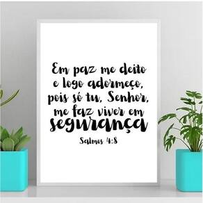 Quadro salmo em paz me deito 45x34cm Moldura: madeira preta Informações do produto tire todas as suas dúvidas no descritivo abaixo: decoração para quarto, sala, cozinha, escritório, área gourmet e muito mais. Chega de paredes vazias. Medidas - cada peça tem 45x34cm a3 . Material do papel - papel fotográfico brilhante de altíssima resolução acabamento - todos os quadros são acompanhados de uma película de acetato para proteção da imagem. - os quadros são embalados de forma segura com plástico bolha com camada dupla de acordo com o tamanho dos quadros. - de 3 meses. Meu quadro chegou. Como posso fixá-lo Você precisa apenas de um martelo e um prego, pois os quadros já vão acompanhados de penduradores. Esta é a forma mais indicada. Caso prefira, você pode utilizar uma fita dupla face neste caso, sugerimos de alta qualidade para evitar que descole e seu quadro caia . Como posso limpar meu quadro A limpeza é feita como um móvel comum da sua casa. Apenas um pano seco ou espanador são suficientes para tal Marca: Não Informado
