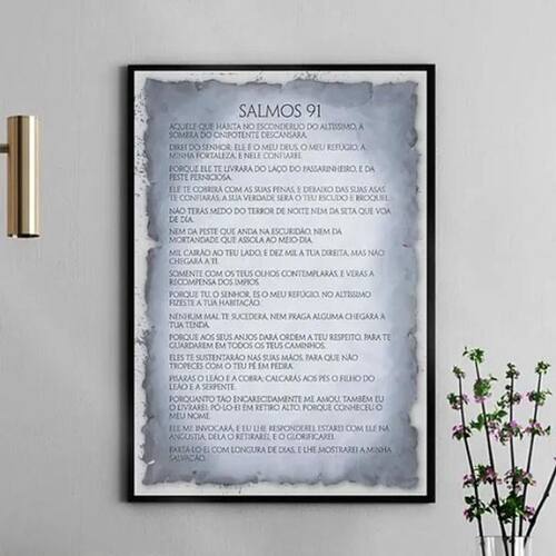 Quadro salmos 91 - papiro cinza 24x18cm - com vidro Cor: moldura preta Informações do produto tire todas as suas dúvidas no descritivo abaixo: decoração para quarto, sala, cozinha, escritório, área gourmet e muito mais. Chega de paredes vazias medidas - cada peça tem 24x18cm a5 . Material do papel - papel fotográfico brilhante de altíssima resolução acabamento - todos os quadros são acompanhados de vidro para proteção da imagem. - moldura em madeira maciça na cor preta ou branca conforme produto escolhido e pendurador . - os quadros são embalados de forma segura com plástico bolha com camada dupla de acordo com o tamanho dos quadros. Garantia - garantia de 3 meses. Meu quadro chegou. Como posso fixá-lo Você precisa apenas de um martelo e um prego, pois os quadros já vão acompanhados de penduradores. Esta é a forma mais indicada. Como posso limpar meu quadro A limpeza é feita como um móvel comum da sua casa. Apenas um pano seco ou espanador são suficientes para tal