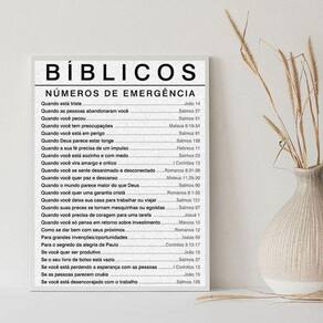 Quadro salmos bíblicos números de emergência 45x34cm - com vidro Moldura: madeira branca Informações do produto tire todas as suas dúvidas no descritivo abaixo: decoração para quarto, sala, cozinha, escritório, área gourmet e muito mais. Chega de paredes vazias medidas - cada peça tem 45x34cm a3 . Material do papel - papel fotográfico brilhante de altíssima resolução acabamento - todos os quadros são acompanhados de vidro para proteção da imagem. - moldura em madeira maciça na cor preta e pendurador . - os quadros são embalados de forma segura com plástico bolha com camada dupla de acordo com o tamanho dos quadros. Garantia - garantia de 3 meses. Meu quadro chegou. Como posso fixá-lo Você precisa apenas de um martelo e um prego, pois os quadros já vão acompanhados de penduradores. Esta é a forma mais indicada. Como posso limpar meu quadro A limpeza é feita como um móvel comum da sua casa. Apenas um pano seco ou espanador são suficientes para tal Ean: 7898003441608
