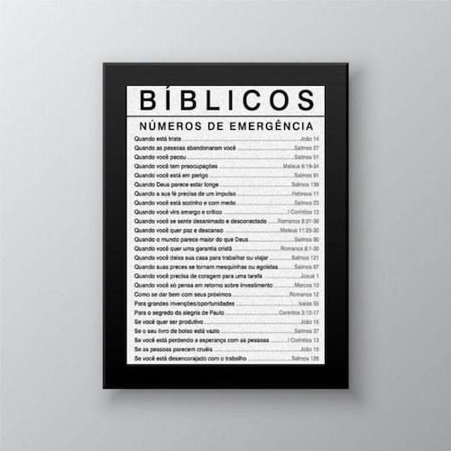 Quadro salmos bíblicos números de emergência 45x34cm Moldura: madeira preta Informações do produto tire todas as suas dúvidas no descritivo abaixo: decoração para quarto, sala, cozinha, escritório, área gourmet e muito mais. Chega de paredes vazias. Medidas - cada peça tem 45x34cm a3 . Material do papel - papel fotográfico brilhante de altíssima resolução acabamento - todos os quadros são acompanhados de uma película de acetato para proteção da imagem. - os quadros são embalados de forma segura com plástico bolha com camada dupla de acordo com o tamanho dos quadros. Garantia - garantia de 3 meses. Meu quadro chegou. Como posso fixá-lo Você precisa apenas de um martelo e um prego, pois os quadros já vão acompanhados de penduradores. Esta é a forma mais indicada. Caso prefira, você pode utilizar uma fita dupla face neste caso, sugerimos de alta qualidade para evitar que descole e seu quadro caia . Como posso limpar meu quadro A limpeza é feita como um móvel comum da sua casa. Apenas um pano seco ou espanador são suficientes para tal Ean: 7894217076445