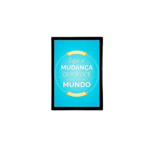 Quadro seja a mudança que você quer ver no mundo 45x34cm - com vidro Moldura: madeira preta Informações do produto tire todas as suas dúvidas no descritivo abaixo: decoração para quarto, sala, cozinha, escritório, área gourmet e muito mais. Chega de paredes vazias medidas - cada peça tem 45x34cm a3 . Material do papel - papel fotográfico brilhante de altíssima resolução acabamento - todos os quadros são acompanhados de vidro para proteção da imagem. - moldura em madeira maciça na cor preta e pendurador . - os quadros são embalados de forma segura com plástico bolha com camada dupla de acordo com o tamanho dos quadros. - de 3 meses. Meu quadro chegou. Como posso fixá-lo Você precisa apenas de um martelo e um prego, pois os quadros já vão acompanhados de penduradores. Esta é a forma mais indicada. Como posso limpar meu quadro A limpeza é feita como um móvel comum da sua casa. Apenas um pano seco ou espanador são suficientes para tal