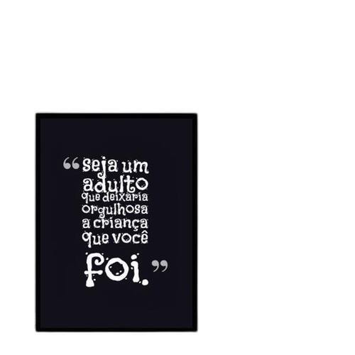 Quadro seja o orgulho de uma criança 33x24cm Moldura: madeira preta Informações do produto Decoração para quarto, sala, cozinha, escritório, área gourmet e muito mais. Chega de paredes vazias Medidas - cada peça tem 33x24cm a4 . Material do papel - papel fotográfico brilhante de altíssima resolução Acabamento - todos os quadros são acompanhados de uma película de acetato para proteção da imagem. - Os quadros são embalados de forma segura com plástico bolha com camada dupla de acordo com o tamanho dos quadros. - de 3 meses. Meu quadro chegou. Como posso fixá-lo Você precisa apenas de um martelo e um prego, pois os quadros já vão acompanhados de penduradores. Esta é a forma mais indicada. Caso prefira, você pode utilizar uma fita dupla face neste caso, sugerimos de alta qualidade para evitar que descole e seu quadro caia . Como posso limpar meu quadro A limpeza é feita como um móvel comum da sua casa. Apenas um pano seco ou espanador são suficientes para tal Marca: Não Informado