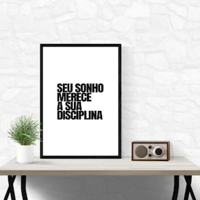 Quadro seu sonho merece sua disciplina 24x18cm - com vidro Cor: moldura branca Informações do produto tire todas as suas dúvidas no descritivo abaixo: decoração para quarto, sala, cozinha, escritório, área gourmet e muito mais. Chega de paredes vazias medidas - cada peça tem 24x18cm a5 . Material do papel - papel fotográfico brilhante de altíssima resolução acabamento - todos os quadros são acompanhados de vidro para proteção da imagem. - moldura em madeira maciça na cor preta ou branca conforme produto escolhido e pendurador . - os quadros são embalados de forma segura com plástico bolha com camada dupla de acordo com o tamanho dos quadros. Garantia - garantia de 3 meses. Meu quadro chegou. Como posso fixá-lo Você precisa apenas de um martelo e um prego, pois os quadros já vão acompanhados de penduradores. Esta é a forma mais indicada. Como posso limpar meu quadro A limpeza é feita como um móvel comum da sua casa. Apenas um pano seco ou espanador são suficientes para tal