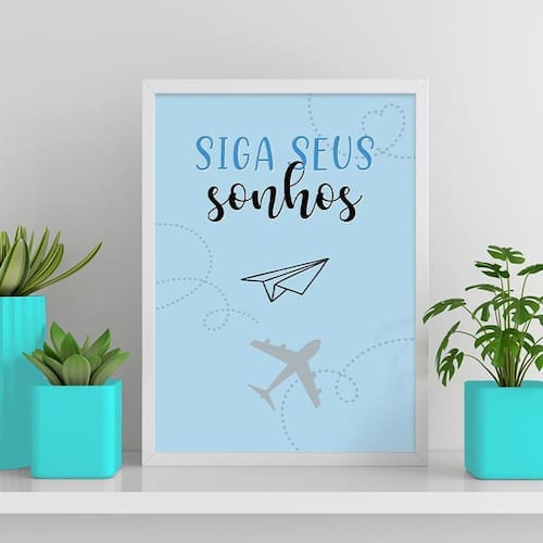 Quadro siga seus sonhos avião azul 45x34cm Moldura: madeira branca Informações do produto Decoração para quarto, sala, cozinha, escritório, área gourmet e muito mais. Chega de paredes vazias Medidas - cada peça tem 45x34cm a3 . Material do papel - papel fotográfico brilhante de altíssima resolução Acabamento - todos os quadros são acompanhados de uma película de acetato para proteção da imagem. - Os quadros são embalados de forma segura com plástico bolha com camada dupla de acordo com o tamanho dos quadros. - de 3 meses. Meu quadro chegou. Como posso fixá-lo Você precisa apenas de um martelo e um prego, pois os quadros já vão acompanhados de penduradores. Esta é a forma mais indicada. Caso prefira, você pode utilizar uma fita dupla face neste caso, sugerimos de alta qualidade para evitar que descole e seu quadro caia . Como posso limpar meu quadro A limpeza é feita como um móvel comum da sua casa. Apenas um pano seco ou espanador são suficientes para tal