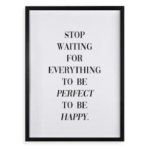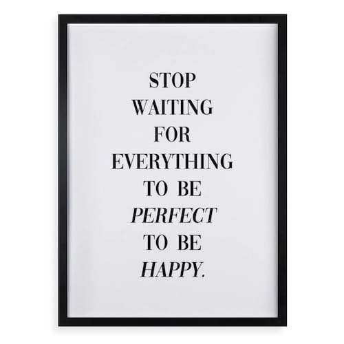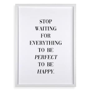 Quadro stop waiting to be happy 24x18cm Cor: moldura branca Informações do produto tire todas as suas dúvidas no descritivo abaixo: decoração para quarto, sala, cozinha, escritório, área gourmet e muito mais. Chega de paredes vazias medidas - cada peça tem 24x18cm a5 . Material do papel - papel fotográfico brilhante de altíssima resolução acabamento - todos os quadros são acompanhados de uma película de acetato para proteção da imagem. - os quadros são embalados de forma segura com plástico bolha com camada dupla de acordo com o tamanho dos quadros. - de 3 meses. Meu quadro chegou. Como posso fixá-lo Você precisa apenas de um martelo e um prego, pois os quadros já vão acompanhados de penduradores. Esta é a forma mais indicada. Caso prefira, você pode utilizar uma fita dupla face neste caso, sugerimos de alta qualidade para evitar que descole e seu quadro caia . Como posso limpar meu quadro A limpeza é feita como um móvel comum da sua casa. Apenas um pano seco ou espanador são suficientes para tal