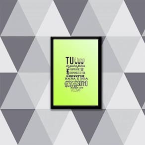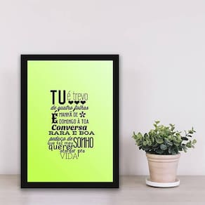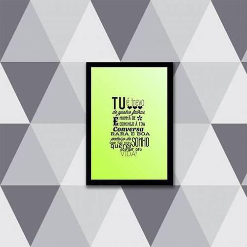 Quadro tu é trevo de quatro folhas 24x18cm Moldura: madeira preta Informações do produto tire todas as suas dúvidas no descritivo abaixo: decoração para quarto, sala, cozinha, escritório, área gourmet e muito mais. Chega de paredes vazias medidas - cada peça tem 24x18cm a5 . Material do papel - papel fotográfico brilhante de altíssima resolução acabamento - todos os quadros são acompanhados de uma película de acetato para proteção da imagem. - moldura em madeira maciça na cor branca e pendurador móvel que pode ser retirado facilmente caso deseje fixar com fita dupla face. - os quadros são embalados de forma segura com plástico bolha com camada dupla de acordo com o tamanho dos quadros. - de 3 meses prazo de envio pedimos 24 horas úteis no máximo para enviar seu pedido após o envio, segue os prazos normais dos correios, cerca de 7 exceto para norte e nordeste, que pode ser de até 14 . Em diversas cidades, este prazo normalmente é reduzido, mas depende do prazo dos correios. Meu quadro chegou. Como posso fixá-lo Você precisa apenas de um martelo e um prego, pois os quadros já vão acompanhados de penduradores. Esta é a forma mais indicada. Caso prefira, você pode utilizar uma fita dupla face neste caso, sugerimos de alta qualidade para evitar que descole e seu quadro caia . Como posso limpar meu quadro A limpeza é feita como um móvel comum da sua casa. Apenas um pano seco ou espanador são suficientes para tal