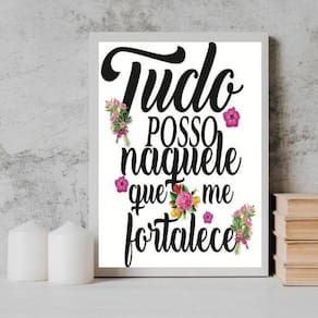 Quadro tudo posso naquele que me fortalece 24x18cm Moldura: madeira branca Informações do produto tire todas as suas dúvidas no descritivo abaixo: decoração para quarto, sala, cozinha, escritório, área gourmet e muito mais. Chega de paredes vazias medidas - cada peça tem 24x18cm a5 . Material do papel - papel fotográfico brilhante de altíssima resolução acabamento - todos os quadros são acompanhados de uma película de acetato para proteção da imagem. - os quadros são embalados de forma segura com plástico bolha com camada dupla de acordo com o tamanho dos quadros. Garantia - garantia de 3 meses. Meu quadro chegou. Como posso fixá-lo Você precisa apenas de um martelo e um prego, pois os quadros já vão acompanhados de penduradores. Esta é a forma mais indicada. Caso prefira, você pode utilizar uma fita dupla face neste caso, sugerimos de alta qualidade para evitar que descole e seu quadro caia . Como posso limpar meu quadro A limpeza é feita como um móvel comum da sua casa. Apenas um pano seco ou espanador são suficientes para tal Ean: 7891576049578